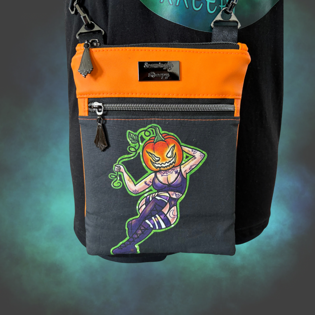 The small cross body bag, made from a cotton pin-up pumpkin cotton panel and Orange faux leather. Perfect for carrying your day-to-day essentials.